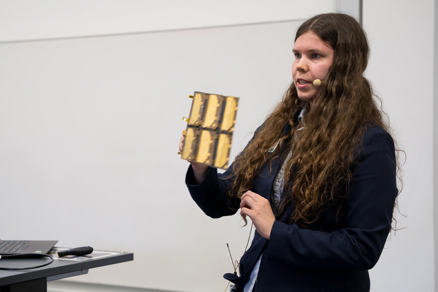 Beim Science Slam stellten zehn Forschende in jeweils vier Minuten ihre Arbeiten mit teils sehr kreativen Präsentationen vor. Intelligente Roboter-Systeme zur Kommunikation in Krisengebieten, ein neues Werkstoffkonzept für Wärmepumpen, Partizipation in der Hochschulbildung für Gesundheitsfachberufe oder die nachhaltige Optimierung von Kartonage-Sets mithilfe von KI - die vielfältigen Beiträge erstreckten sich über das gesamte Forschungsspektrum der THD. Schließlich überzeugte Julia Wallner die Fachjury mit ihrem Vortrag über „Weltraum-Kunststoff-Origami“ und gewann den Preis für die beste Präsentation. Für das Projekt HighPower entwickelte sie am THD-Standort in Hutthurm die sich selbst öffnende Trägerstruktur faltbarer Solarmodule für Satelliten. Einer der dort gefertigten Prototypen wird schon bald für Tests ins All starten. Nun forscht sie an weiteren Anwendungsgebieten für die Technologie.