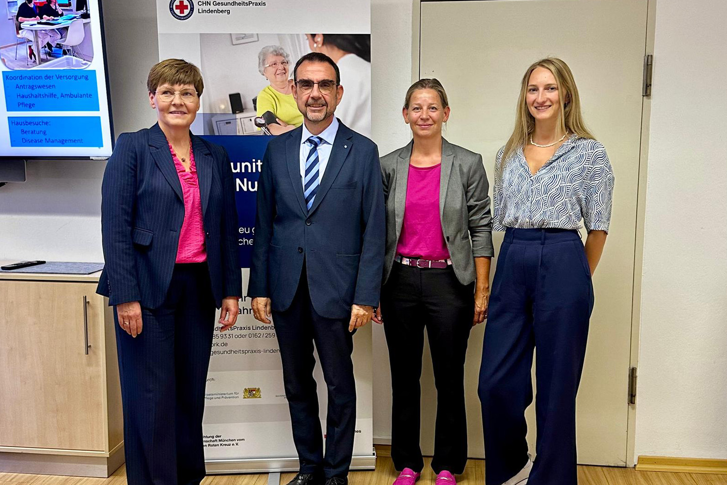 Vertreterinnen des wissenschaftlichen Projekts Community Health Nursing (CHN) aus Lindenberg und von der Technischen Hochschule Deggendorf (THD) haben am 7. Juli den CSU-Fraktionsvorsitzenden im Bayerischen Landtag und ehemaligen Gesundheitsminister des Freistaats, Klaus Holetschek, sowie Lindenbergs ersten Bürgermeister Eric Ballerstedt zum fachlichen Austausch begrüßt. Die Politiker informierten sich in der ehemaligen Rotkreuzklinik in Lindenberg über den aktuellen Stand und die Perspektiven des vom Bayerischen Staatsministerium für Gesundheit, Pflege und Prävention geförderten THD-Projekts, das seit Mai 2025 in Zusammenarbeit mit der Schwesternschaft München vom Bayerischen Roten Kreuz e.V. und einer ortsansässigen Arztpraxis durchgeführt wird. Ziel ist der Aufbau einer koordinierten, wohnortnahen und multiprofessionellen Gesundheitsversorgung für die Bevölkerung in Lindenberg und Umgebung – insbesondere für die wachsende Zahl älterer Menschen.