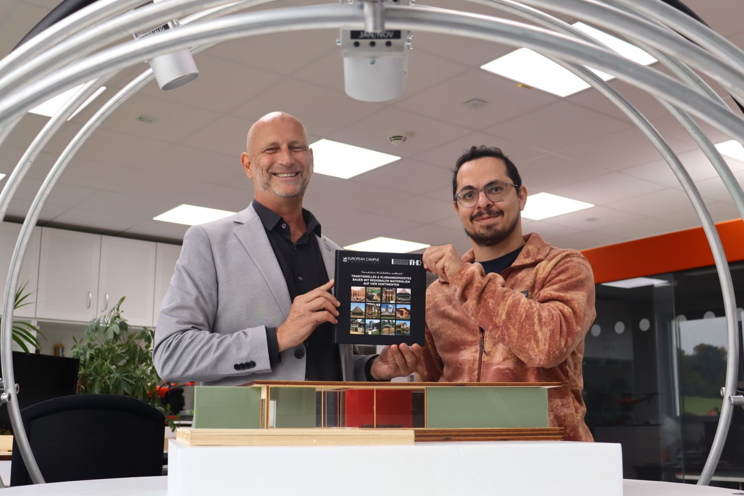 Bild (ECRI/THD): Präsentieren das frisch gedruckte und erweiterte Begleitbuch über „Traditionelles und klimaangepasstes Bauen mit regionalen Materialien auf vier Kontinenten“: Prof. Dr.-Ing. Michael Laar (links) vom European Campus Rottal-Inn der Technischen Hochschule Deggendorf und wissenschaftlicher Mitarbeiter Amirhossein Farsinejad (Master of Engineering).