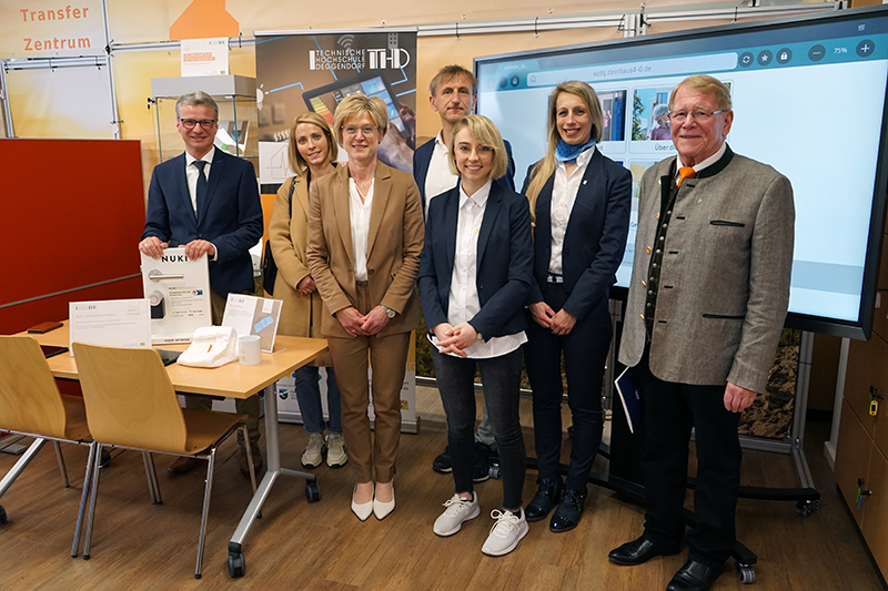 Das Forschungsprojekt DeinHaus 4.0, angesiedelt an der Fakultät Angewandte Gesundheitswissenschaften (AGW) der Technischen Hochschule Deggendorf (THD), erforscht technisch-digital gestützte Lösungen, die im Wohnumfeld unterstützen und wird vom Bayerischen Staatsministerium für Gesundheit und Pflege gefördert. Im neu eröffneten „Erlebniszentrum Digitale Gesundheit“ in Deggendorf können Interessierte die Erkenntnisse und Möglichkeiten nun hautnah und vor Ort kennenlernen. Anlässlich der feierlichen Eröffnung im Mai kamen Landrat Bernd Sibler, Deggendorfs zweiter Bürgermeister Günther Pammer, THD-Kanzlerin Birgit Augustin, Dekan Prof. Dr. Christian Rester sowie die Projektverantwortlichen in die Land-Au.