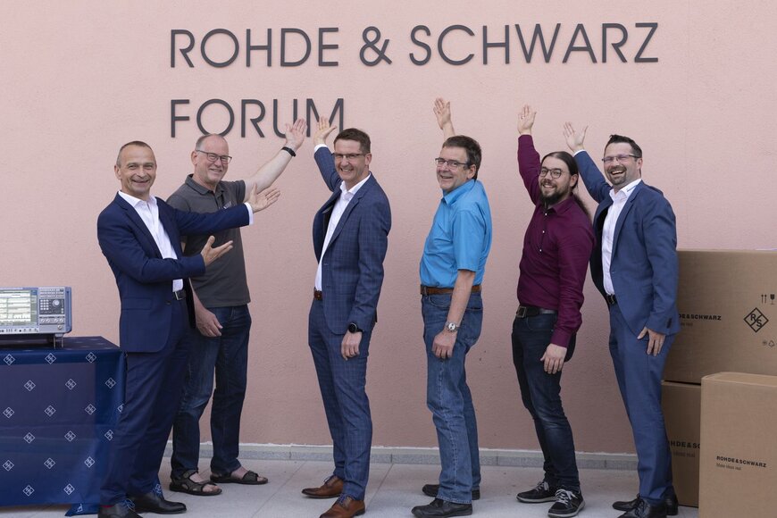 Bild (THD): (v.l.n.r.) Stolzer Moment für alle Beteiligten: Johann Kraus, stellvertretender Bereichsleiter Operations bei Rohde & Schwarz und ehemaliger Werkleiter in Teisnach, THD-Präsident Prof. Dr. Peter Sperber, Rohde & Schwarz Werkleiter Florian Bielmeier, Prof. Dr.-Ing. Werner Bogner, Prof. Dr. Martin Schramm und Prof. Dr.-Ing. Stefan Zorn.