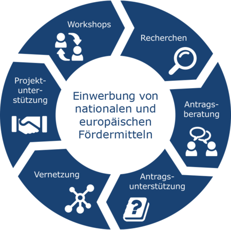 Der Bereich der Fördermittelberatung und Antragsunterstützung umfasst das breite Spektrum der Einwerbung von Fördermitteln und dabei die folgenden Aufgabenbereiche: