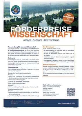 Die Gregor Louisoder Umweltstiftung vergibt jährlich Förderpreise an junge Wissenschaftler:innen, deren Master- oder Doktorarbeiten sich besonders für Umwelt- und Naturschutz einsetzen. Die Preise sind mit insgesamt 5.000 € dotiert und richten sich an Arbeiten mit Praxisbezug in verschiedenen Fachrichtungen.